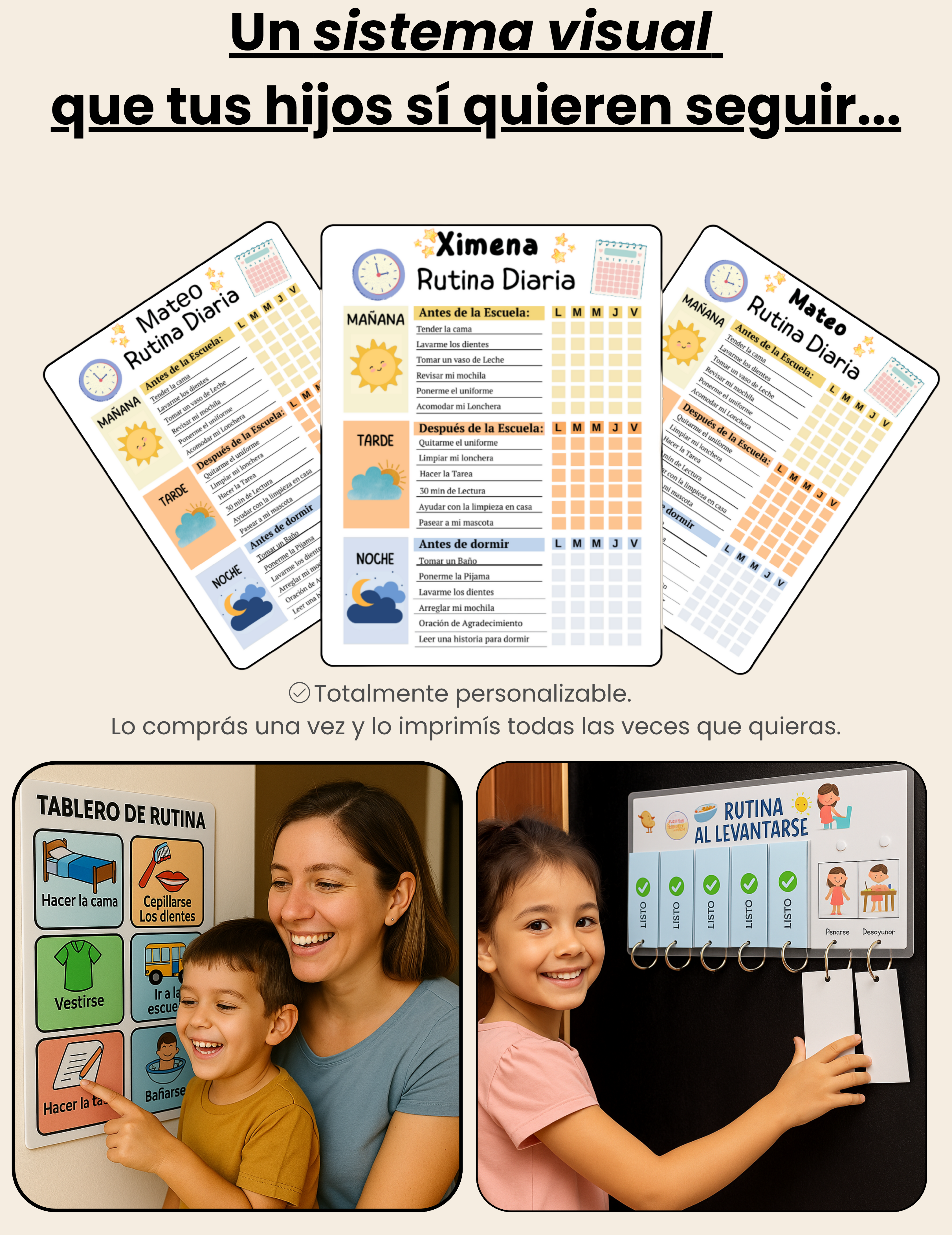 Imprimí las guías, pegá las rutinas en la heladera o en la pieza, y empezá a ver cómo tus días fluyen con más orden, más amor y menos berrinches 💛